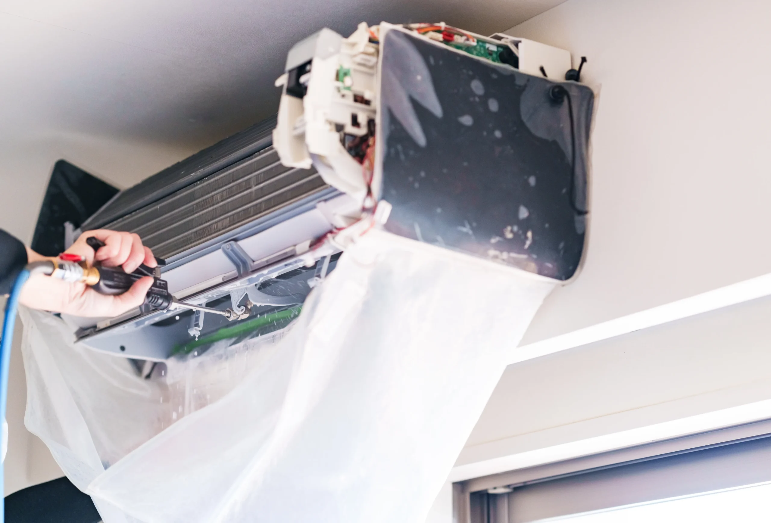 天井埋込型エアコンの内部に溜まったカビやホコリを分解洗浄します。オフィスや店舗などの空間を清潔で快適な状態に整えます。